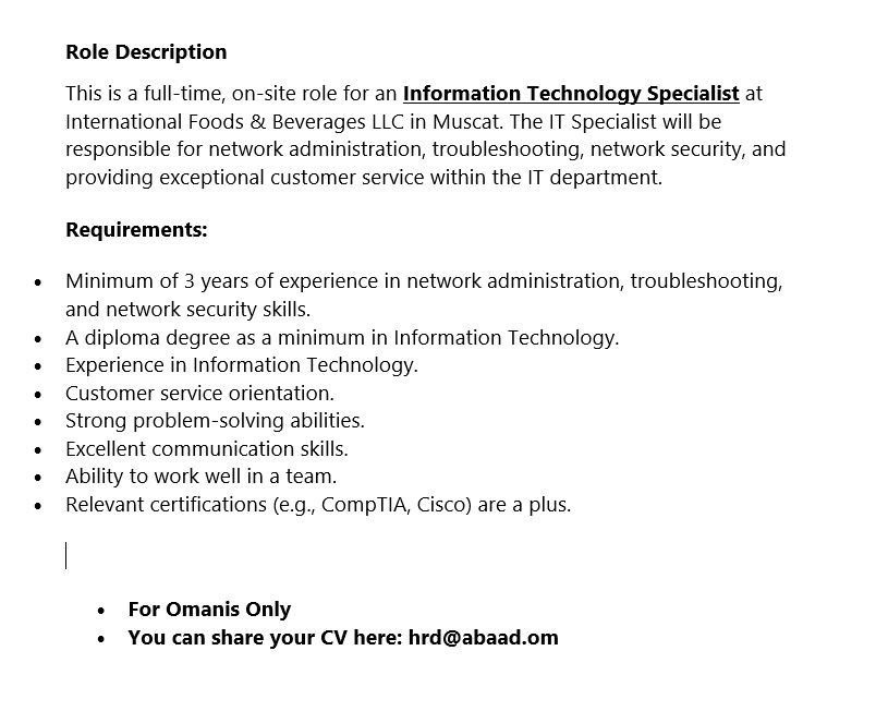 الدولية للأغذية والمشروبات - وظيفة شاغرة ( Information Technology Specialist )