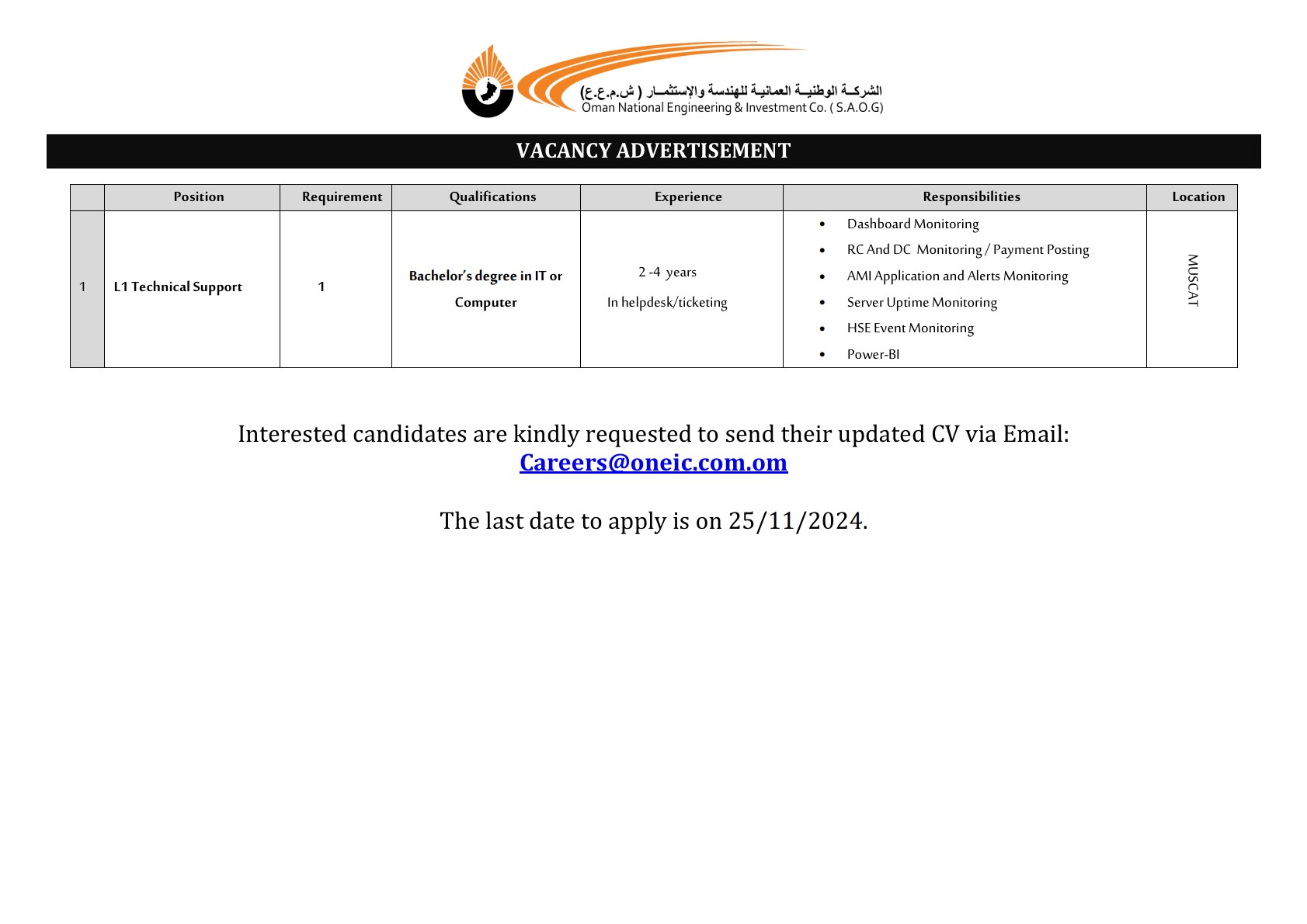 الشركة الوطنية العمانية للهندسة والاستثمار - وظيفة شاغرة ( L1 Technical Support )