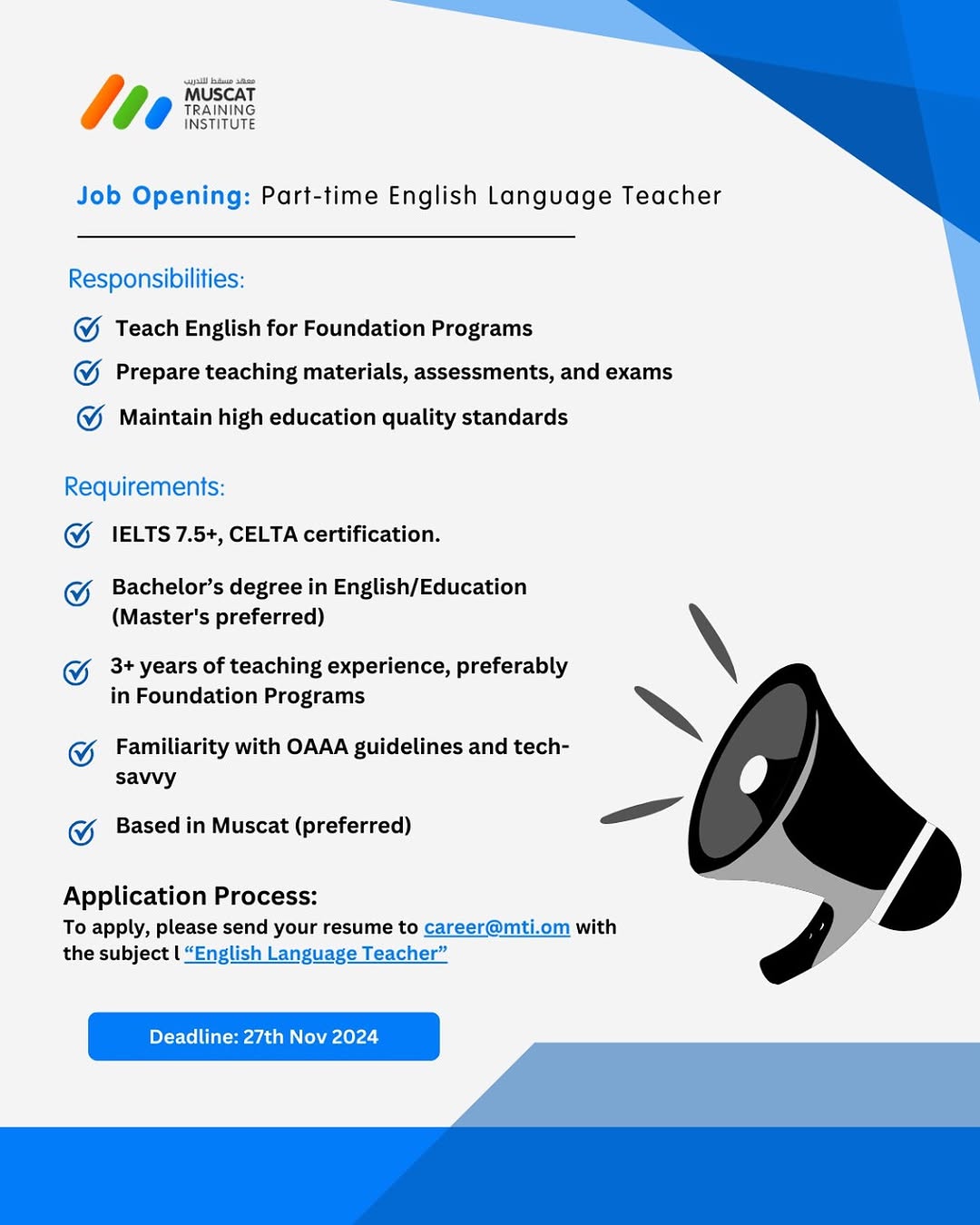 معهد مسقط للتدريب - وظيفة شاغرة بدوام جزئي ( English Language Teacher )