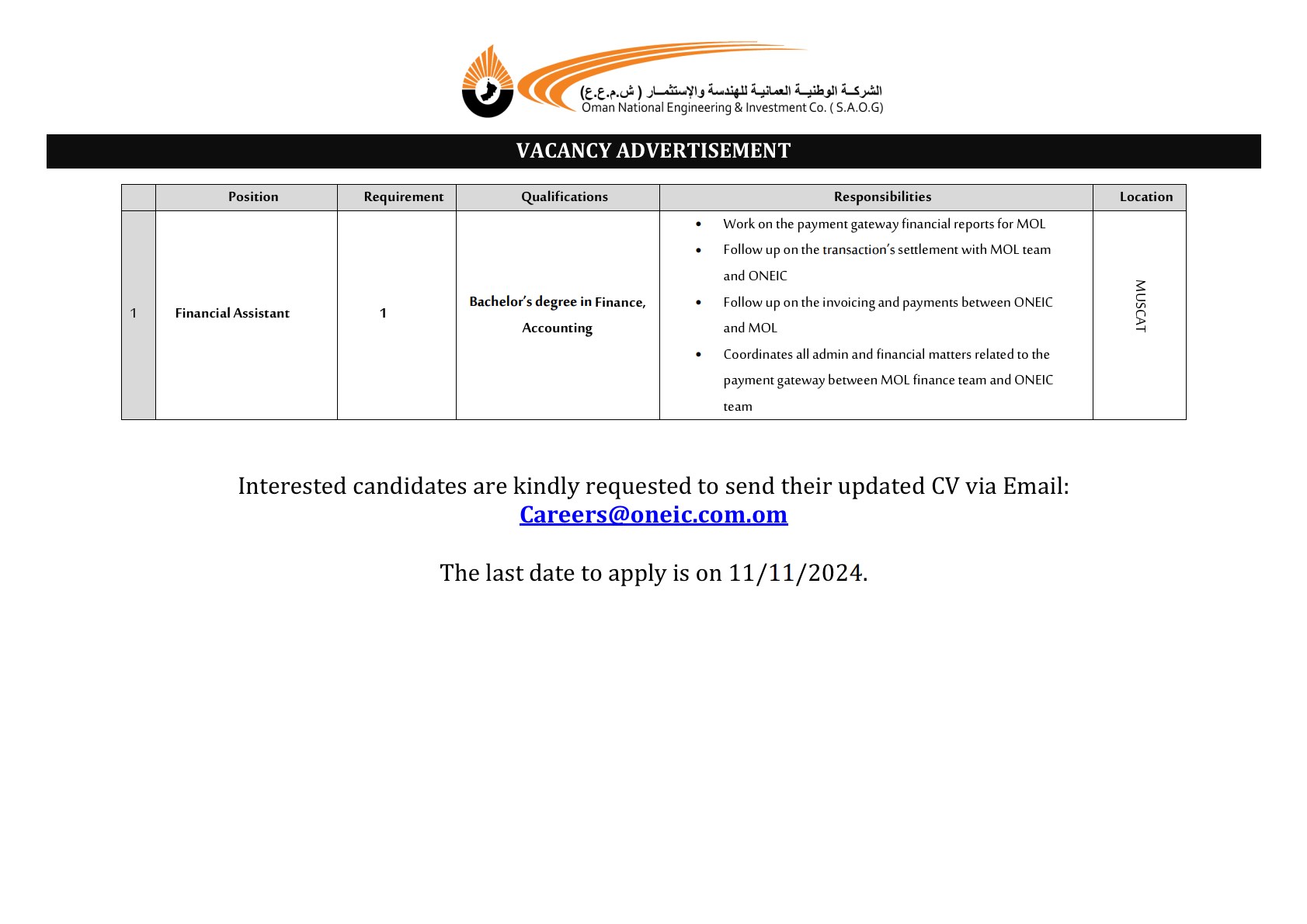 الشركة الوطنية العمانية للهندسة والإستثمار - وظيفة شاغرة ( Financial Assistant )