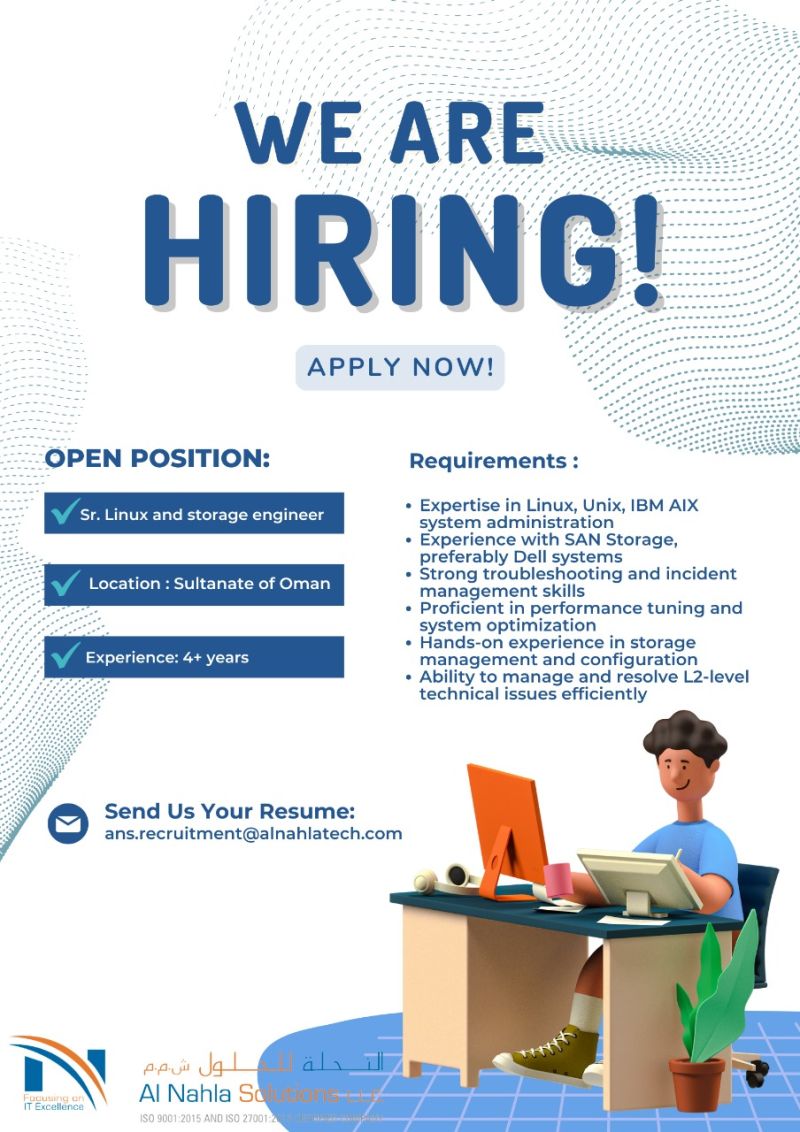 شركة النحلة للحلول - وظيفة شاغرة ( Sr. Linux and storage engineer )