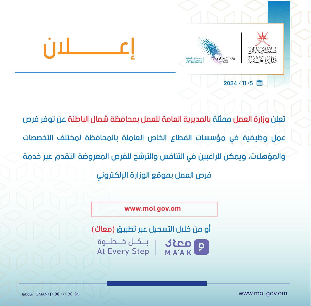 وزارة العمل ممثلة بالمديرية العامة للعمل في محافظة شمال الباطنة - توفر فرص عمل وظيفية في مؤسسات القطاع الخاص