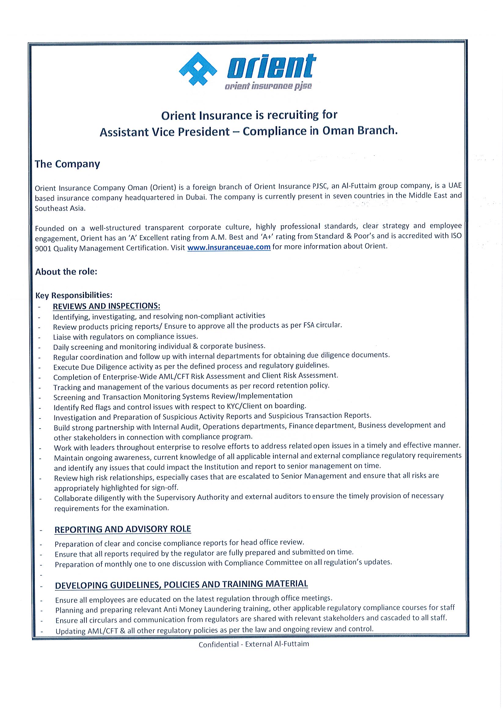 شركة أورينت للتأمين - وظيفة شاغرة ( Assistant Vice President - Compliance in Oman Branch )