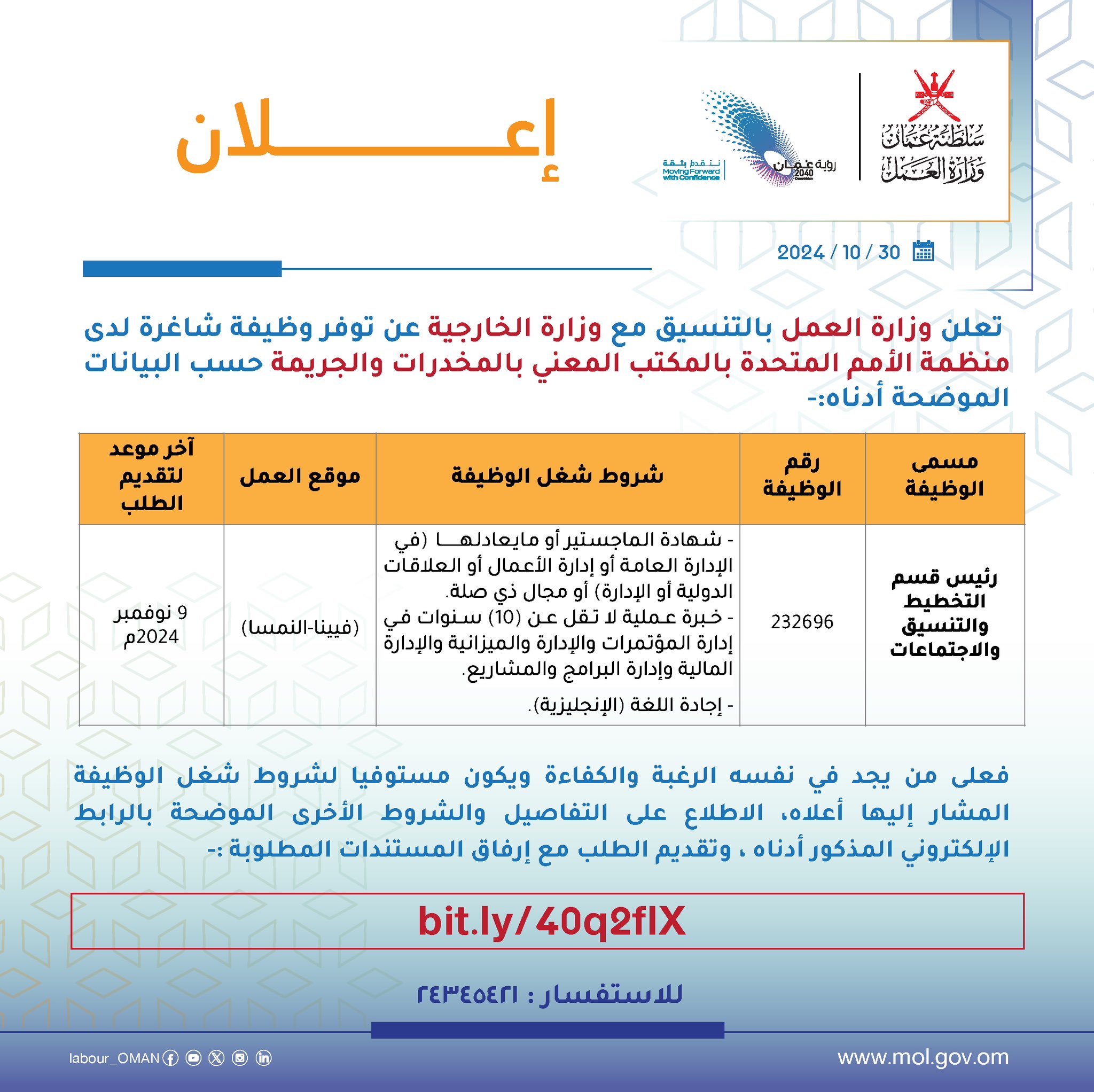 وزارة العمل بالتنسيق مع وزارة الخارجية - توفر وظيفة شاغرة لدى منظمة الأمم المتحدة