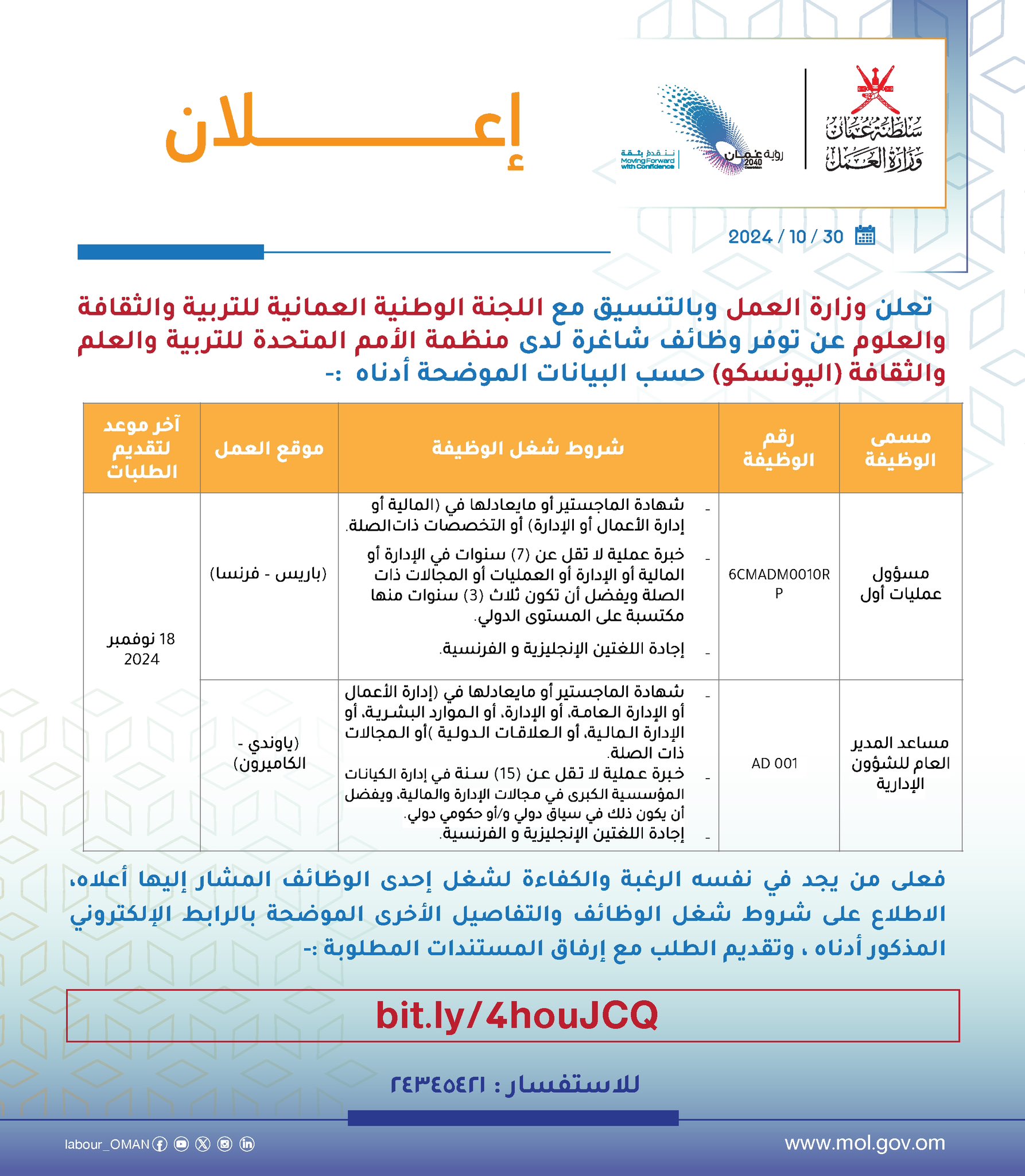 وزارة العمل بالتنسيق مع اللجنة الوطنية العمانية للتربية والثقافة والعلوم - توفر وظائف شاغرة لدى منظمة اليونسكو