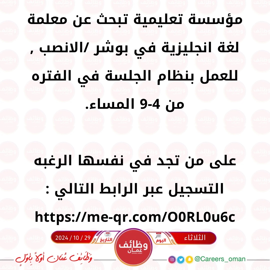مؤسسة تعليمية في بوشر/الانصب - وظيفة شاغرة بنظام الجلسة ( معلمة لغة انجليزية )