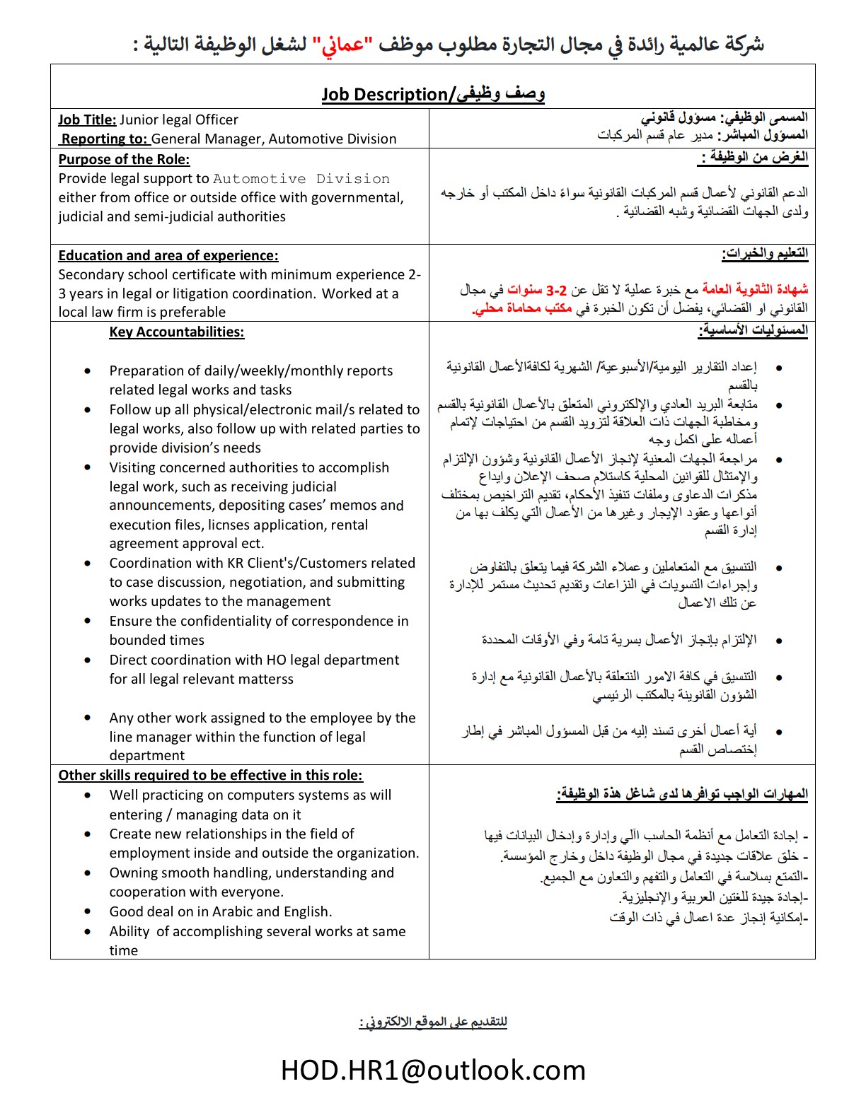 شركة عالمية رائدة في مجال التجارة - وظيفة شاغرة ( مسؤول قانوني )