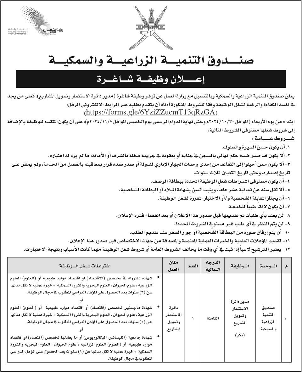 صندوق التنمية الزراعية والسمكية - وظيفة شاغرة (مدير دائرة الاستثمار وتمويل المشاريع)
