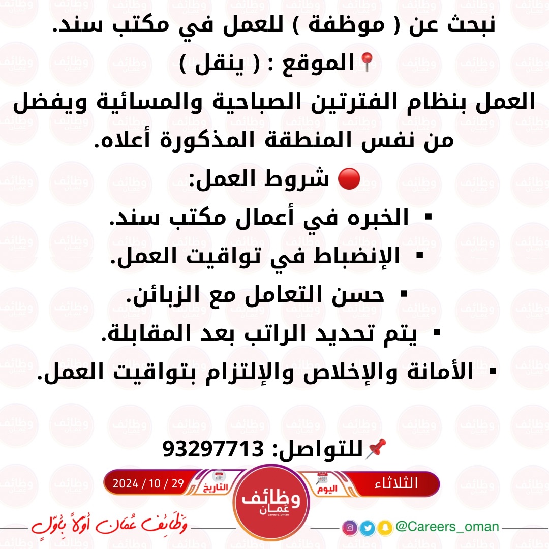 مكتب سند للخدمات في ينقل - وظيفة شاغرة ( موظفة )