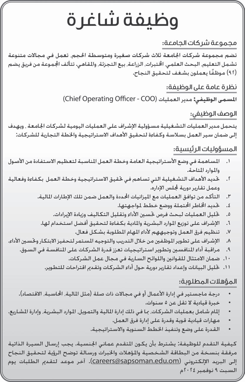 مجموعة شركات الجامعة - وظيفة شاغرة ( مدير العمليات COO )