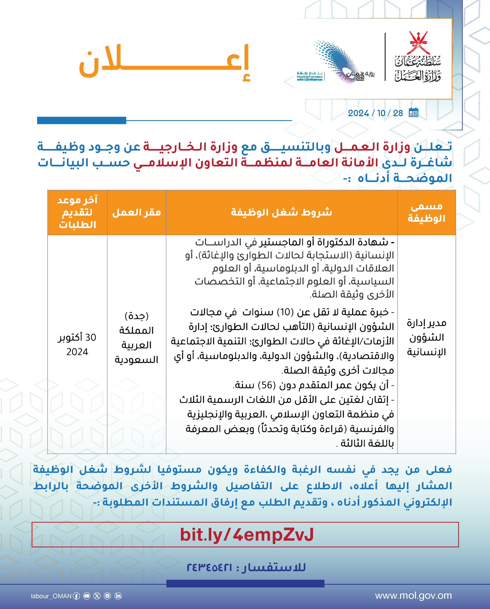 وزارة العمل بالتنسيق مع وزارة الخارجية - توفر وظيفة شاغرة لدى الأمانة العامة لمنظمة التعاون الإسلامي