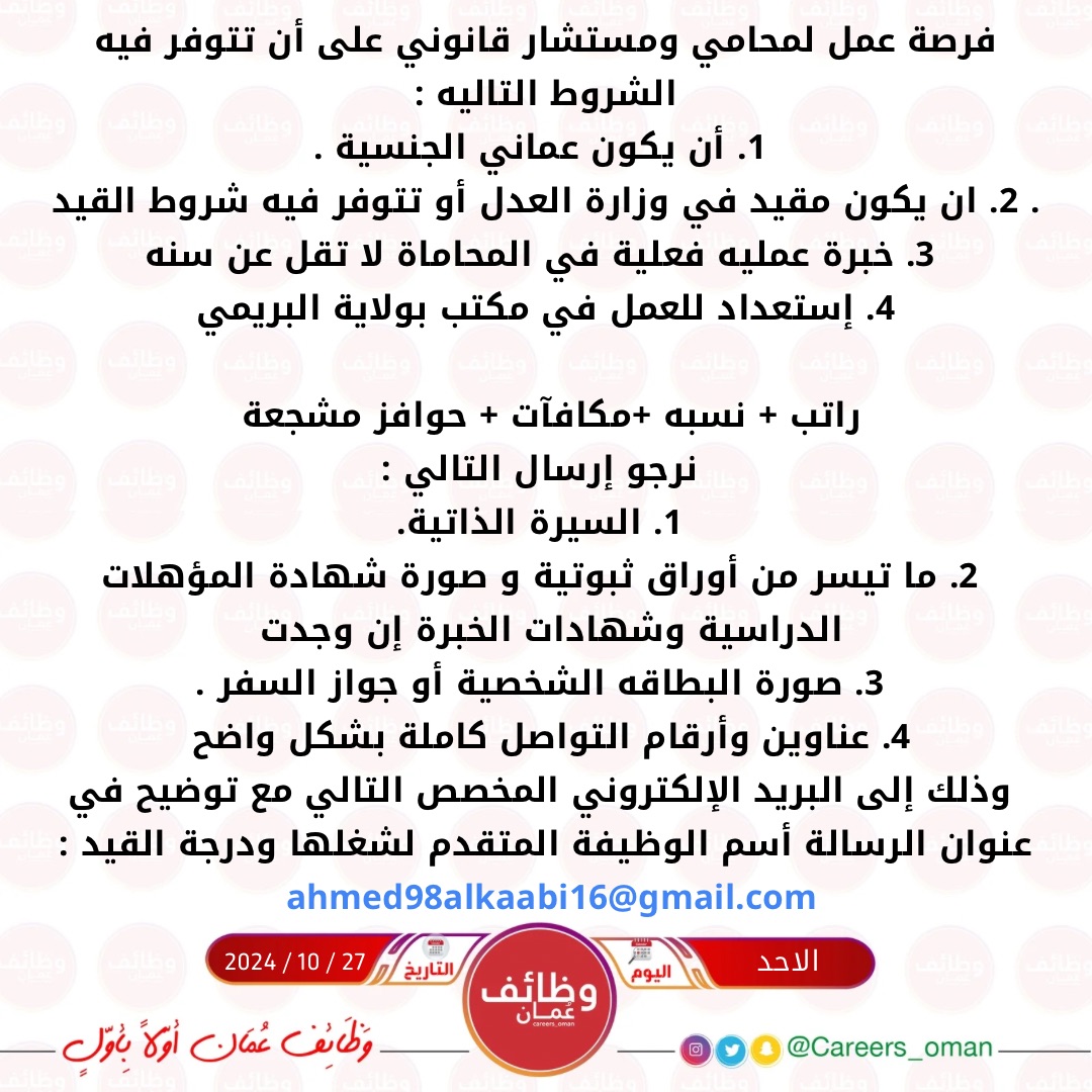 مكتب محاماة بولاية البريمي - وظيفة شاغرة ( محامي ومستشار قانوني )