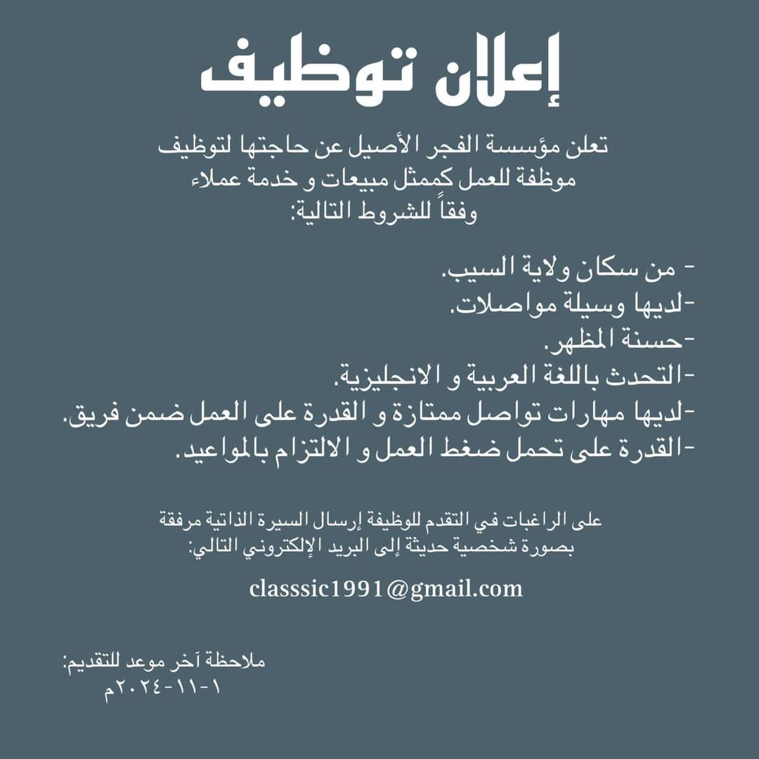 مؤسسة الفجر الأصيل - وظيفة شاغرة ( موظفة ممثل مبيعات وخدمة عملاء )