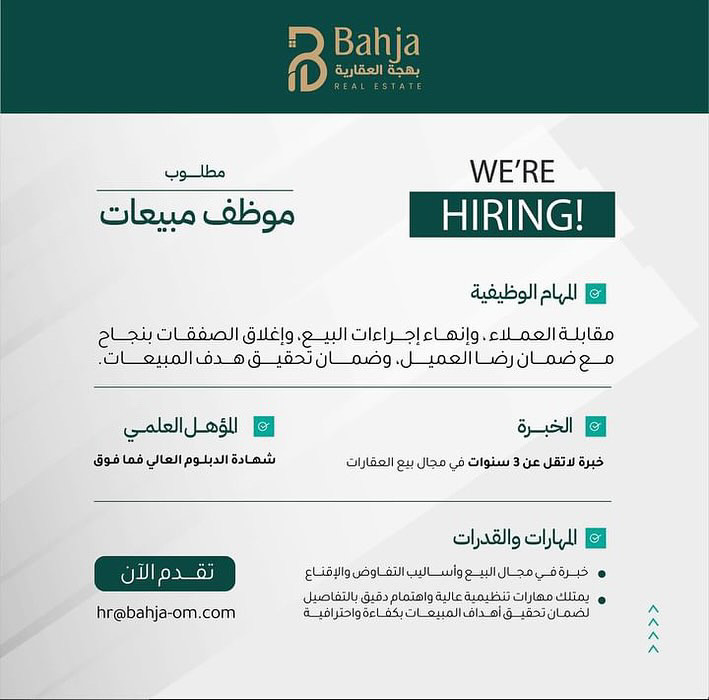 شركة بهجة العقارية - وظيفة شاغرة ( موظف مبيعات )