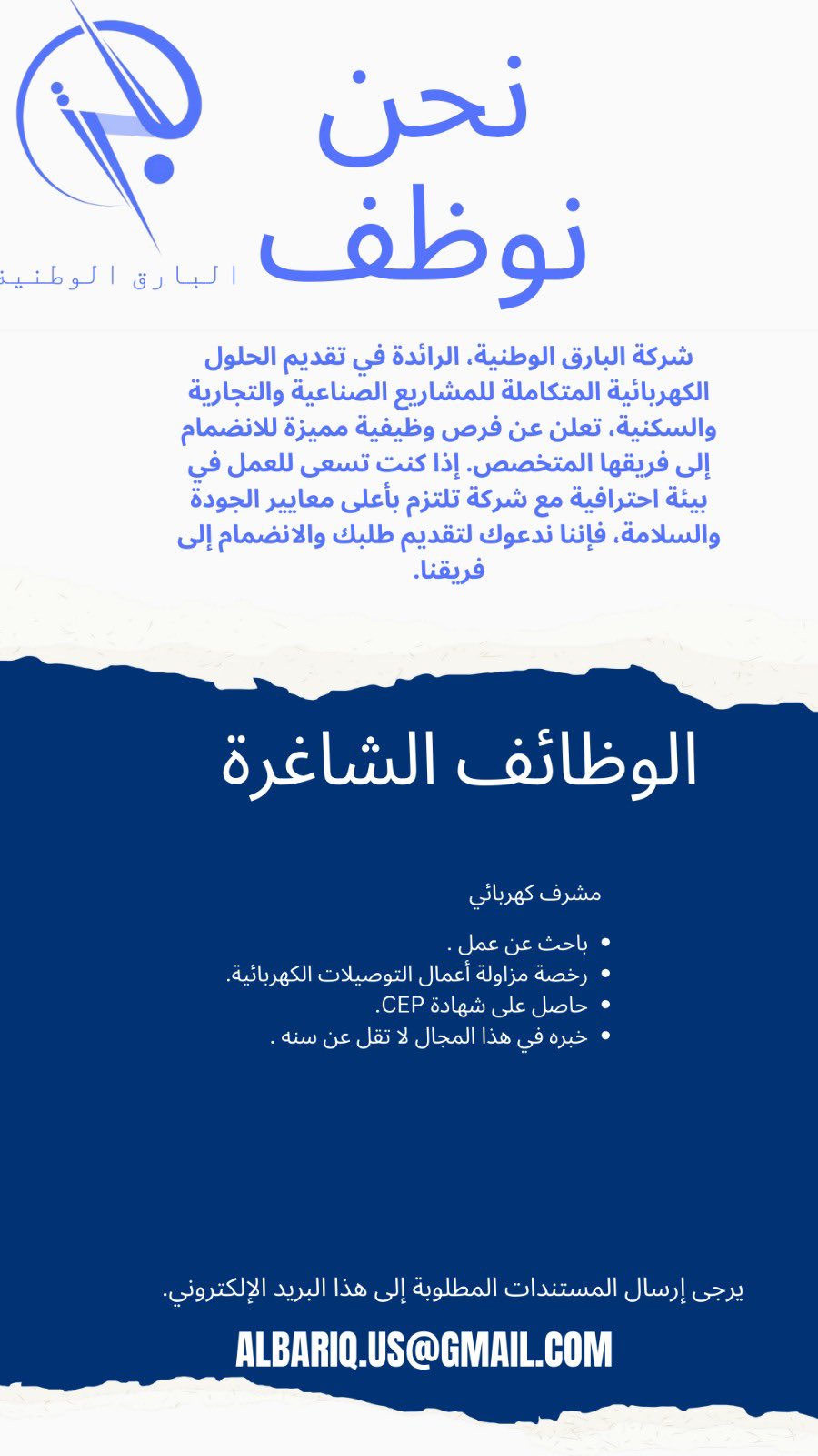 شركة البارق الوطنية - فرصة وظيفية ( مشرف كهرباء )