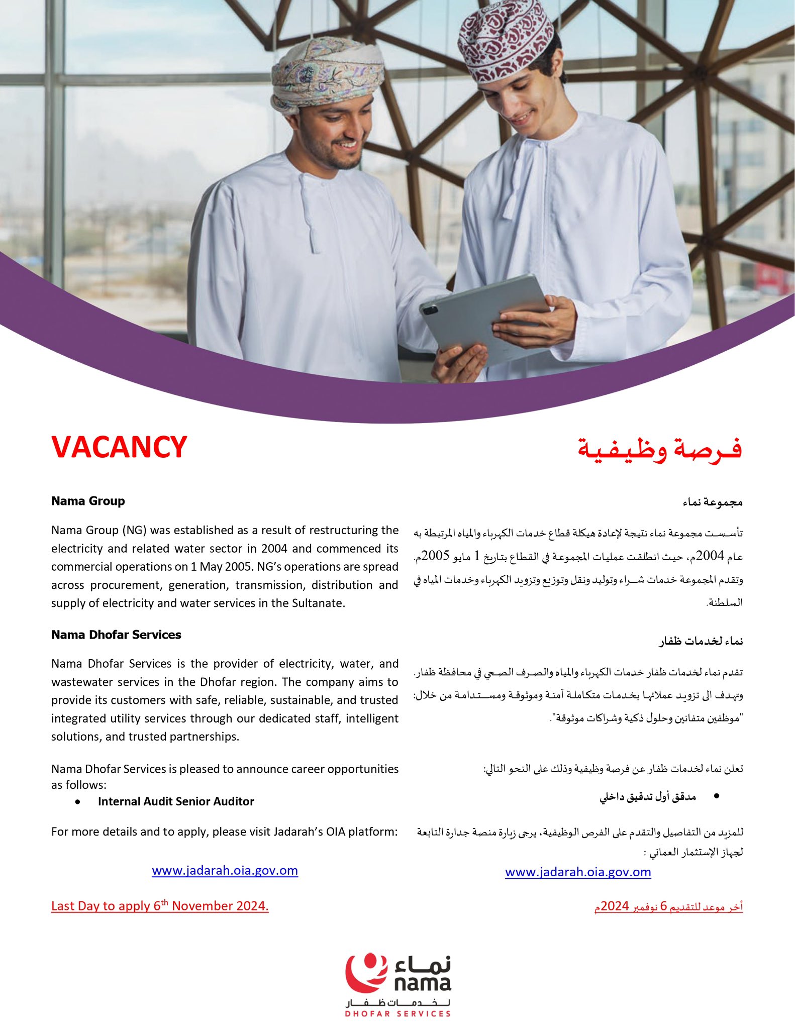 نماء لخدمات ظفار - وظيفة شاغرة ( مدقق أول تدقيق داخلي )