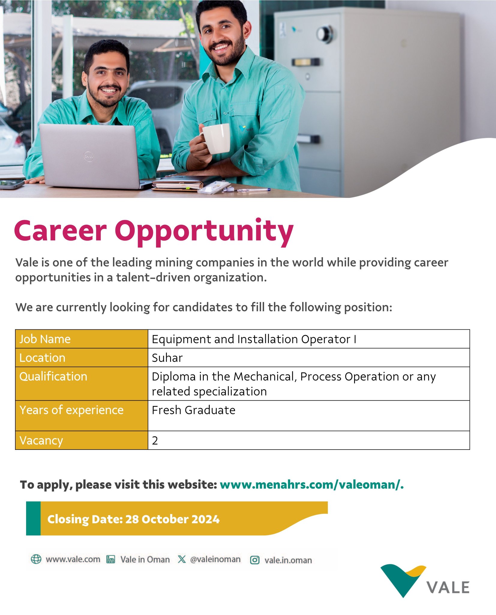 شركة فالي عمان - وظيفة شاغرة ( Equipment and Installation Operator )