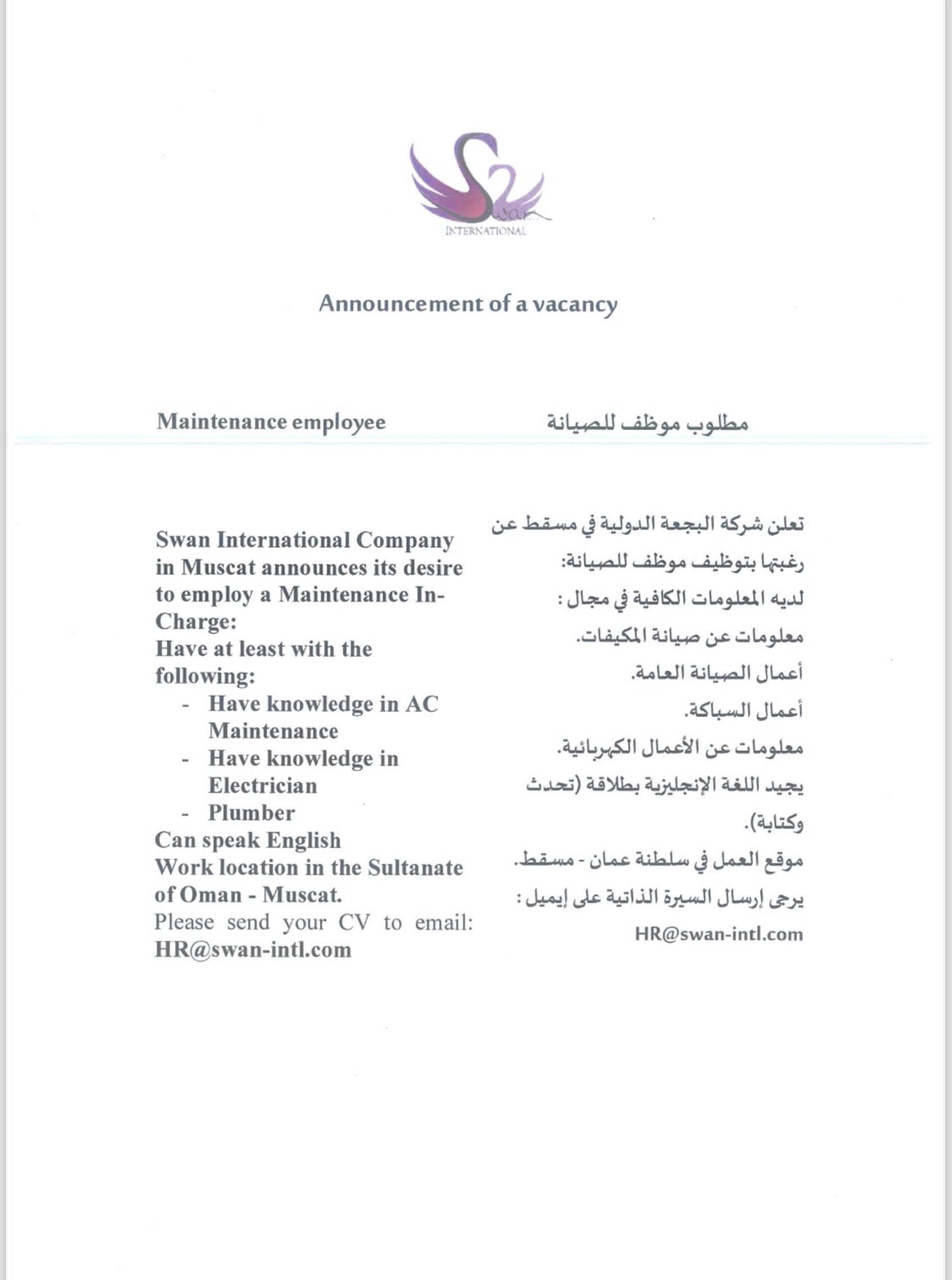 شركة البجعة الدولية في مسقط - فرص وظيفية ( موظف مبيعات + موظف صيانة )