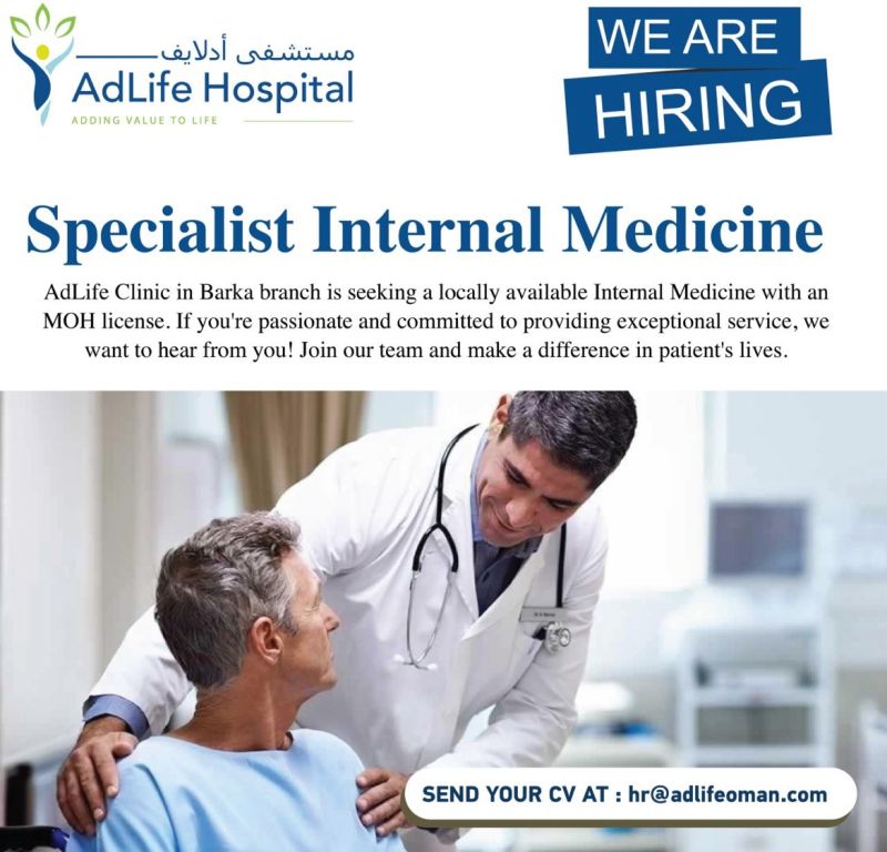 مستشفى أدلايف في بركاء - وظيفة شاغرة ( Specialist Internal Medicine )