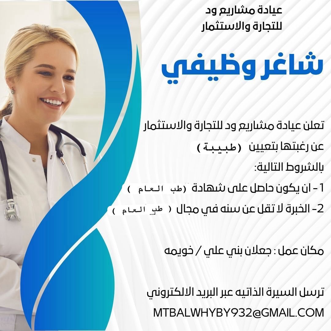 عيادة مشاريع ود للتجارة والاستثمار - وظيفة شاغرة ( طبيبة )