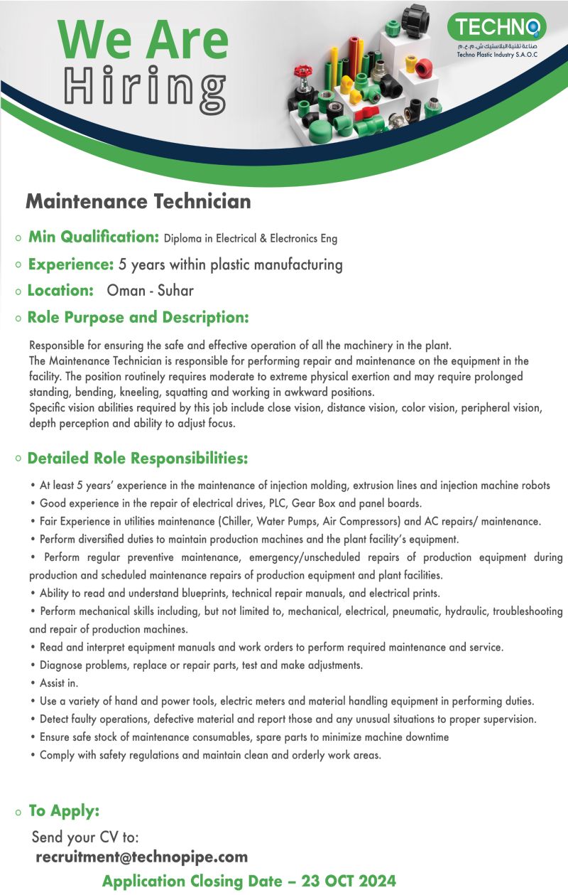 شركة تكنو لتقنية صناعة البلاستيك - فرص وظيفية