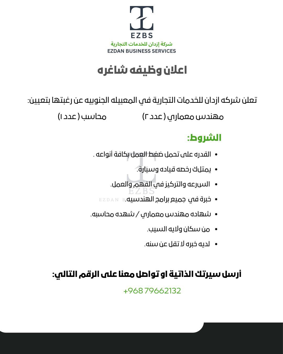 شركة ازدان للخدمات التجارية في المعبيلة الجنوبية - وظائف شاغرة ( مهندس معماري + محاسب )