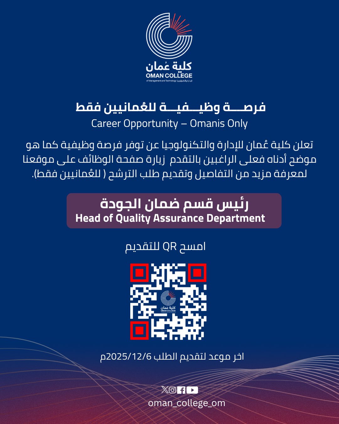 كلية عمان للإدارة والتكنولوجيا - وظيفة شاغرة ( رئيس قسم ضمان الجودة )