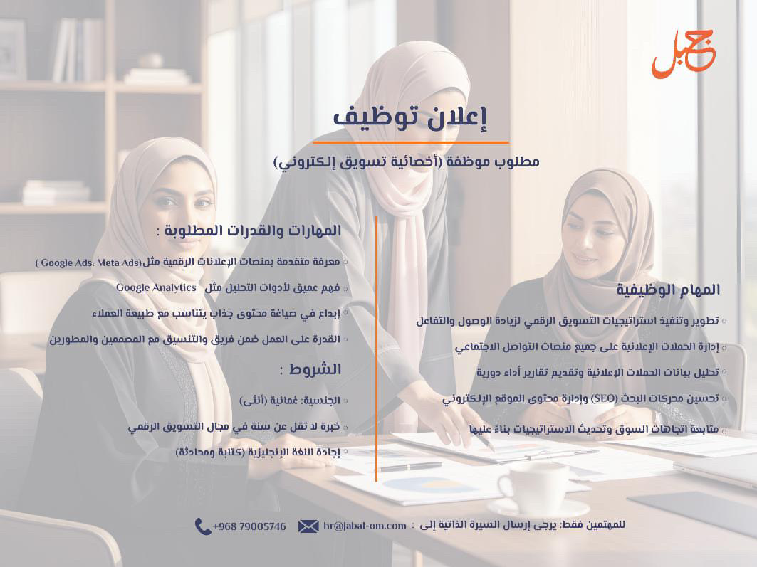 شركة جبل العقارية الخوض - وظيفة شاغرة ( موظفة أخصائية تسويق إلكتروني )