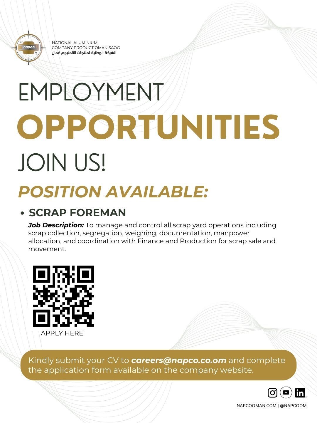 الشركة الوطنية لمنتجات الألمنيوم - وظيفة شاغرة ( SCRAP FOREMAN )