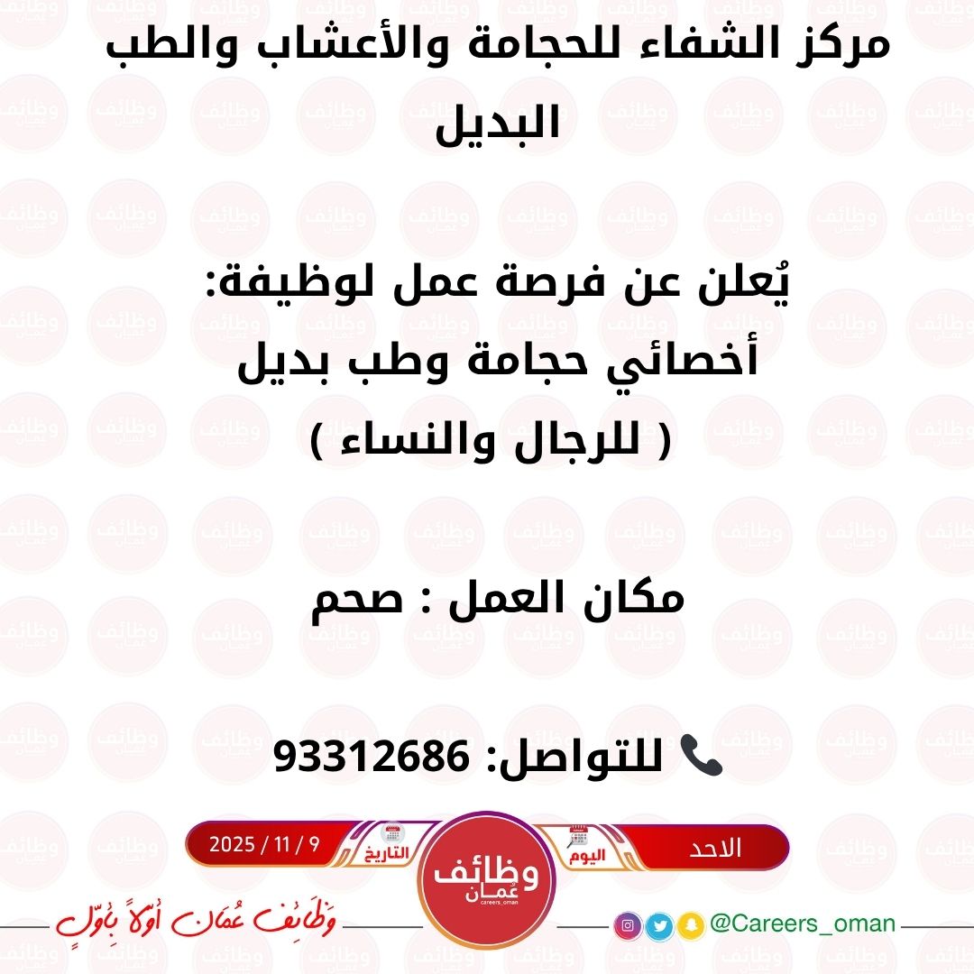 مركز الشفاء للحجامة والأعشاب والطب البديل في صحم - وظيفة شاغرة ( أخصائي حجامة وطب بديل )