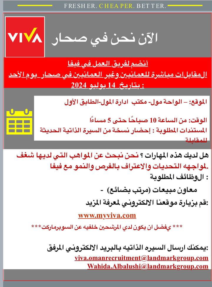 سوبرماركت فيفا في صحار - مقابلات مباشرة لتوظيف معاون مبيعات
