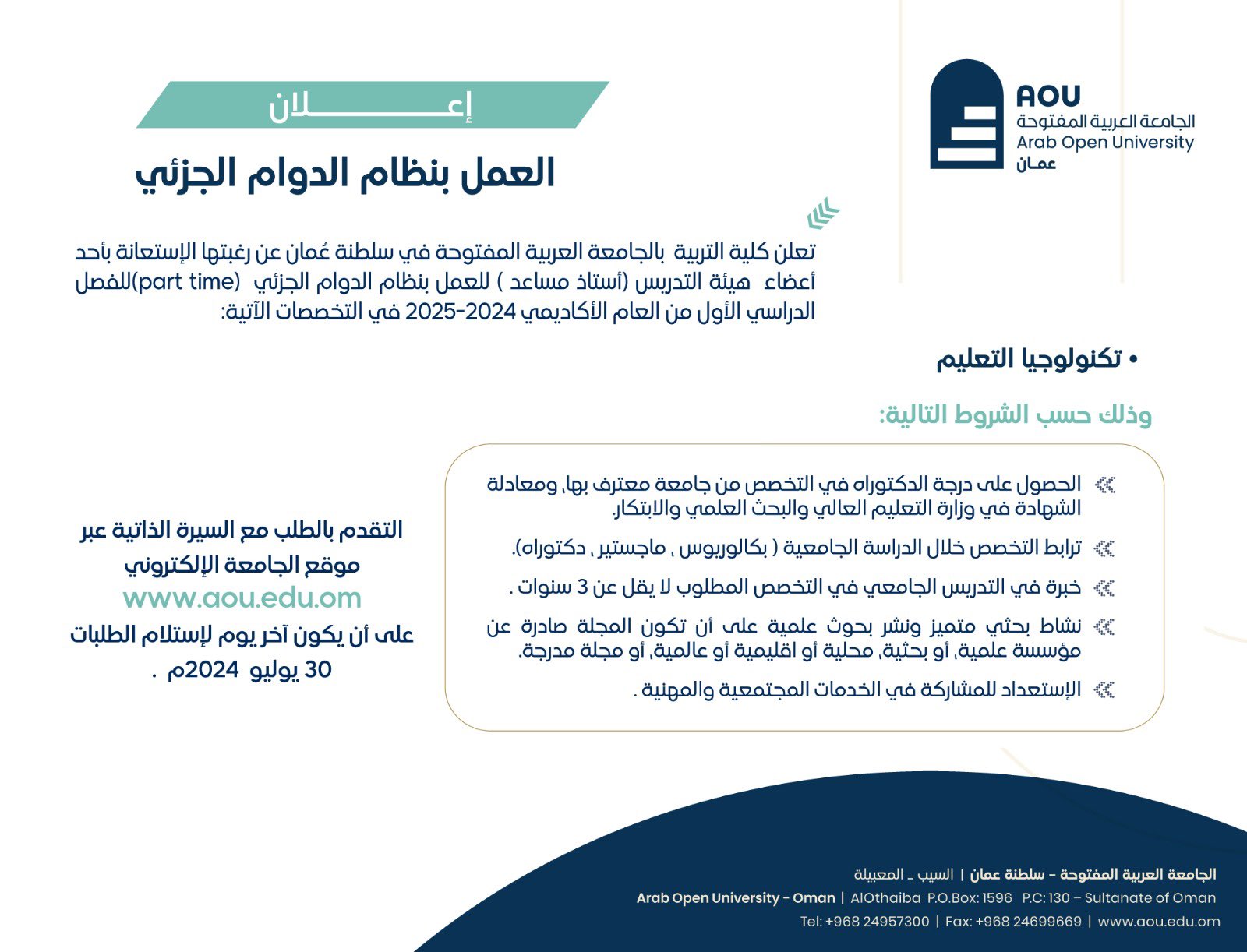الجامعة العربية المفتوحة - وظيفة شاغرة بنظام العمل الجزئي ( استاذ مساعد )