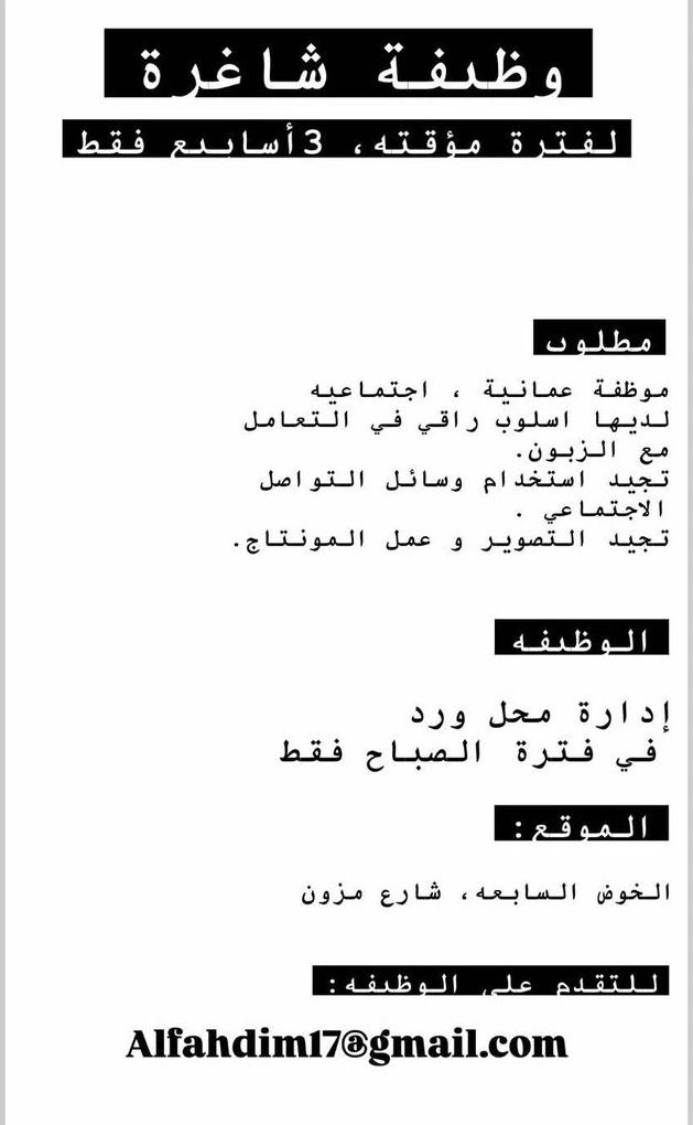 محل ورد في الخوض - وظيفة شاغرة مؤقتة ( موظفة )