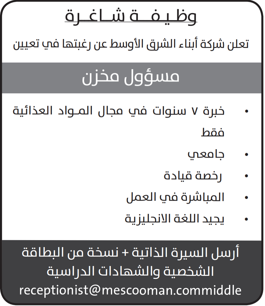 شركة أبناء الشرق الأوسط - وظيفة شاغرة ( مسؤول مخزن )