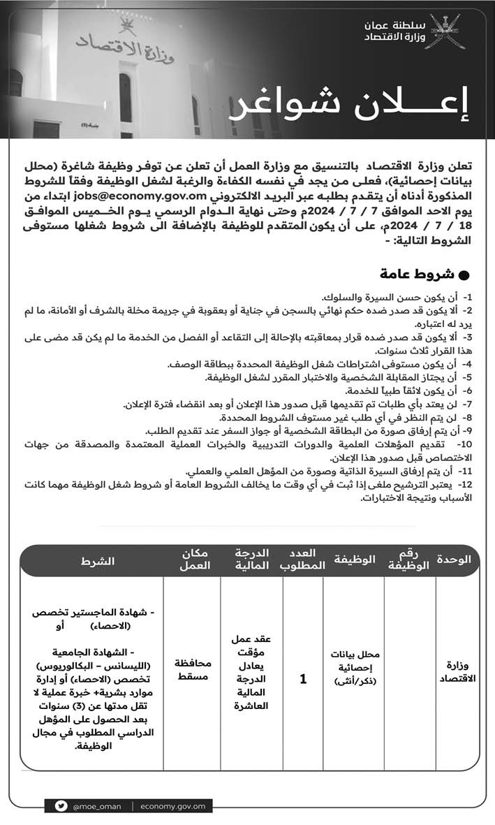 وزارة الاقتصاد - وظيفة شاغرة ( محلل بيانات إحصائية )
