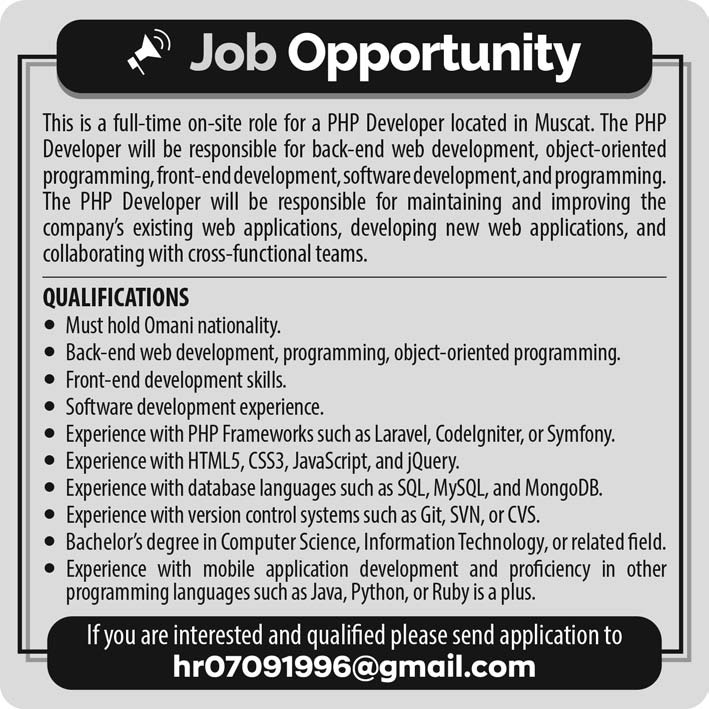 شركة رائدة في مسقط - وظيفة شاغرة ( PHP Developer )