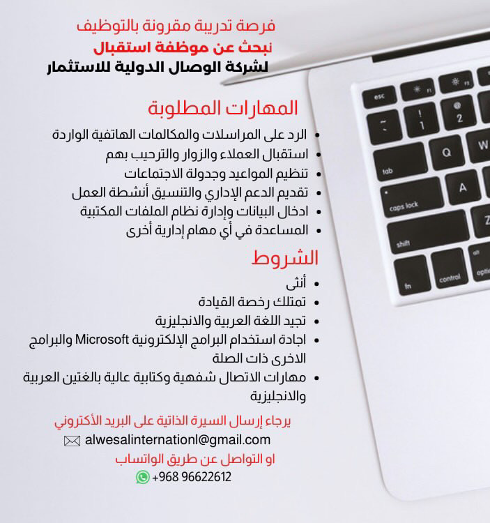 شركة الوصال الدولية للاستثمار - فرصة تدريبية مقرونة بالتوظيف ( موظفة استقبال )