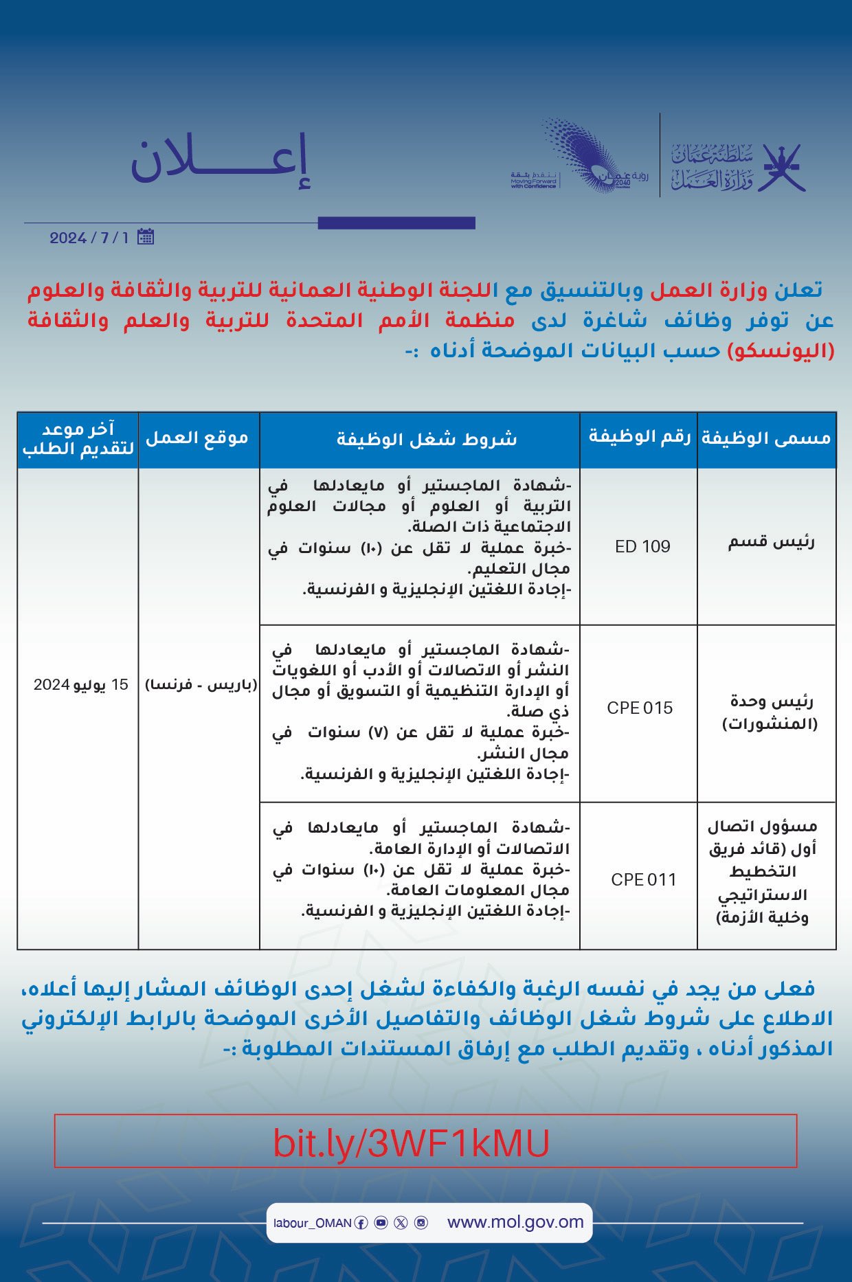 وزارة العمل بالتنسيق مع اللجنة الوطنية العمانية للتربية والثقافة والعلوم عن توفر وظائف شاغرة لدى منظمة(اليونسكو)