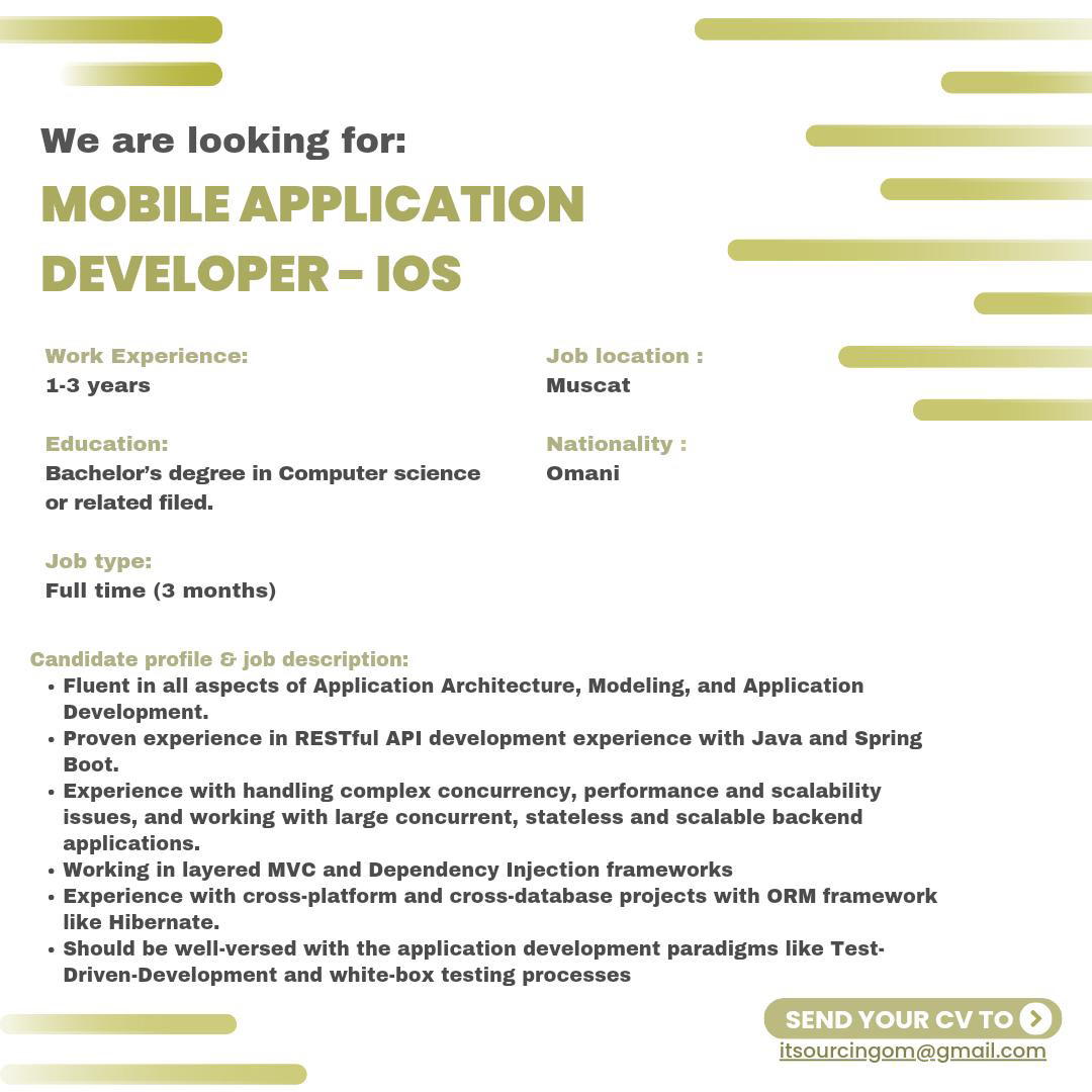 شركة رائدة في مسقط - وظيفة شاغرة ( MOBILE APPLICATION DEVELOPER - IOS )