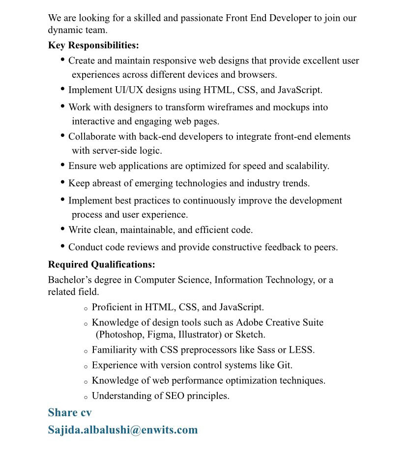 احدى الشركات الرائدة - وظيفة شاغرة ( Front End Developer )
