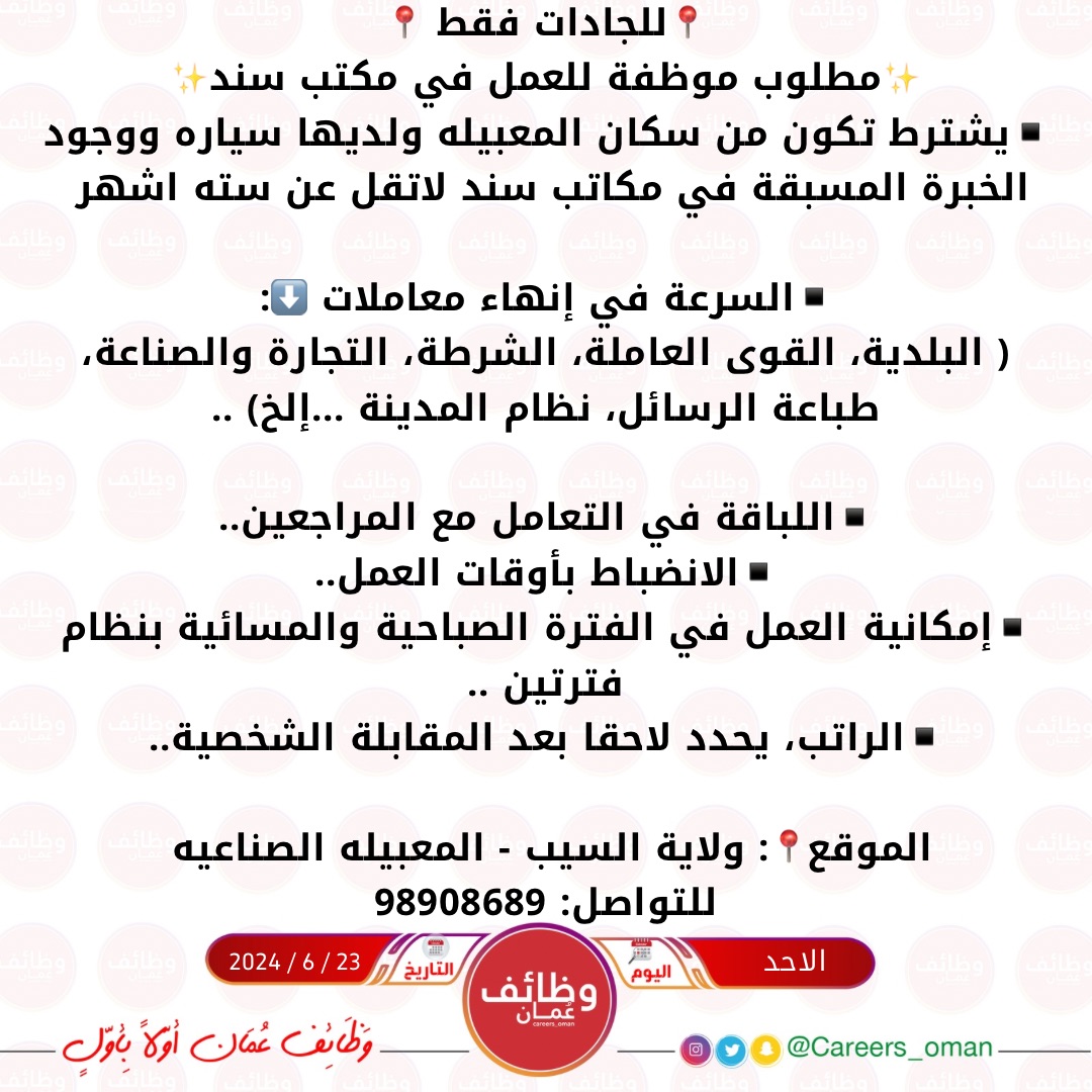 مكتب سند في المعبيلة - فرصة وظيفية ( موظفة )