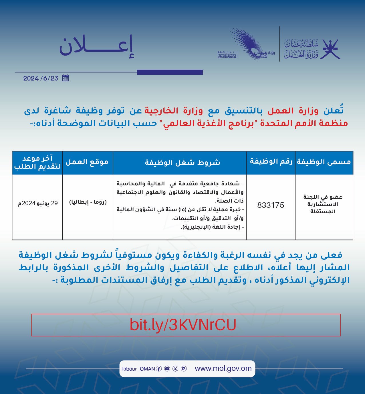 وزارة العمل بالتنسيق مع وزارة الخارجية - توفر وظيفة شاغرة لدى منظمة الأمم المتحدة "برنامج الأغذية العالمي"