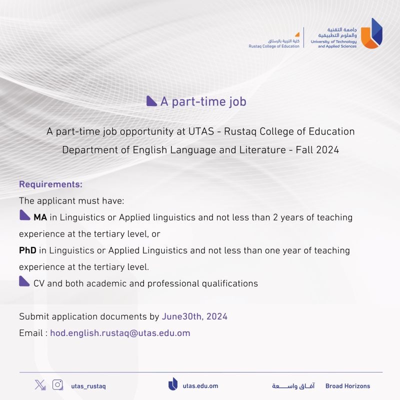 جامعة التقنية والعلوم التطبيقية - فرصة عمل بدوام جزئي في كلية التربية بالرستاق، قسم اللغة الإنجليزية وآدابها