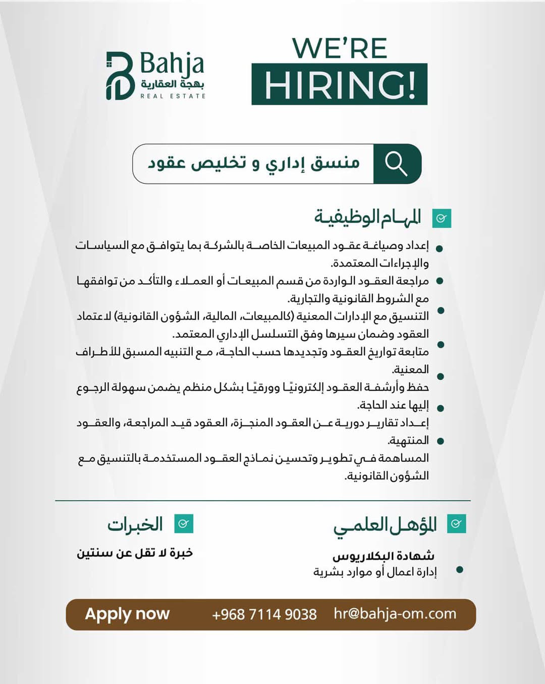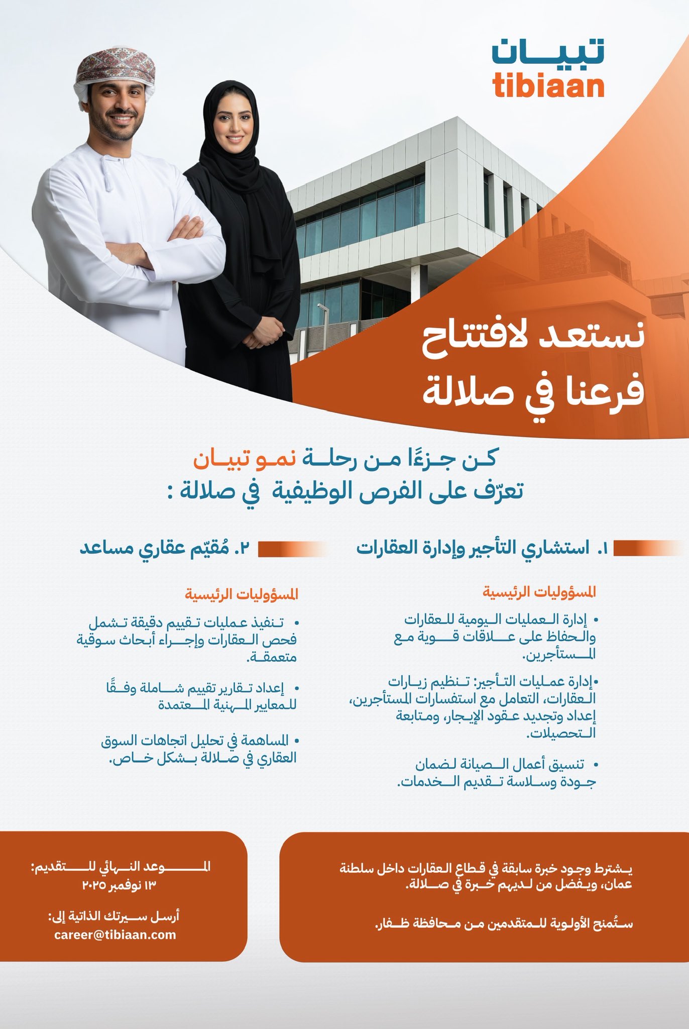 شركة تبيان العقارية فرع صلالة - وظيفتين شاغرتين