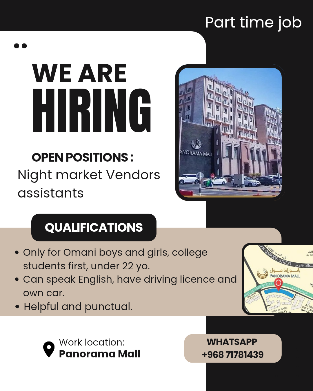 شركة رائدة في بانوراما مول - وظيفة شاغرة ( Night market Vendors assistants )