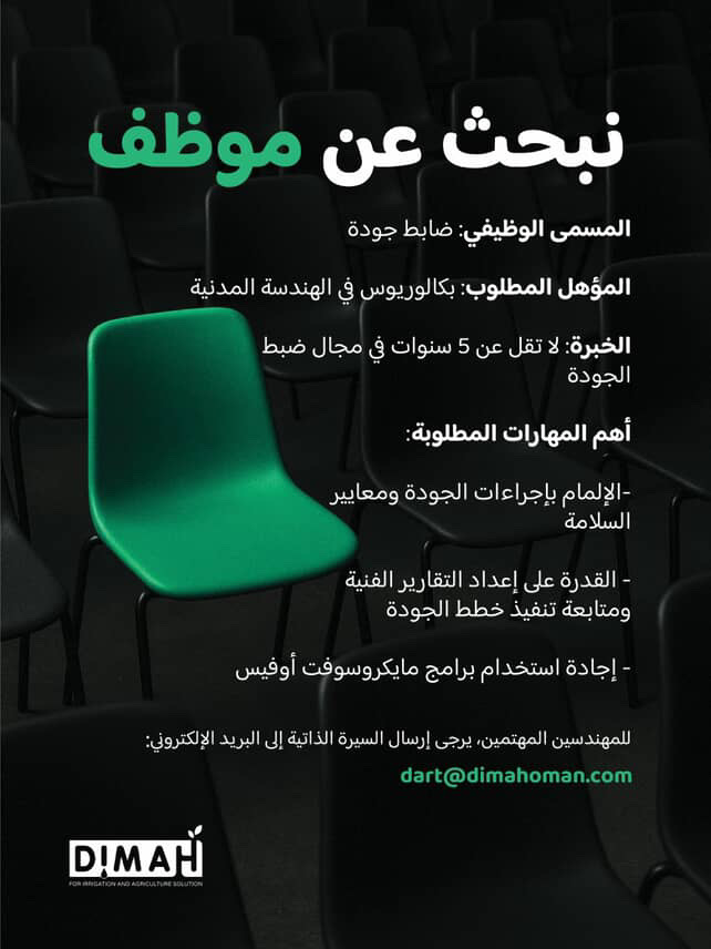 شركة ديمة للريّ والحلول الزراعية بمسقط - وظيفة شاغرة ( ضابط جودة )