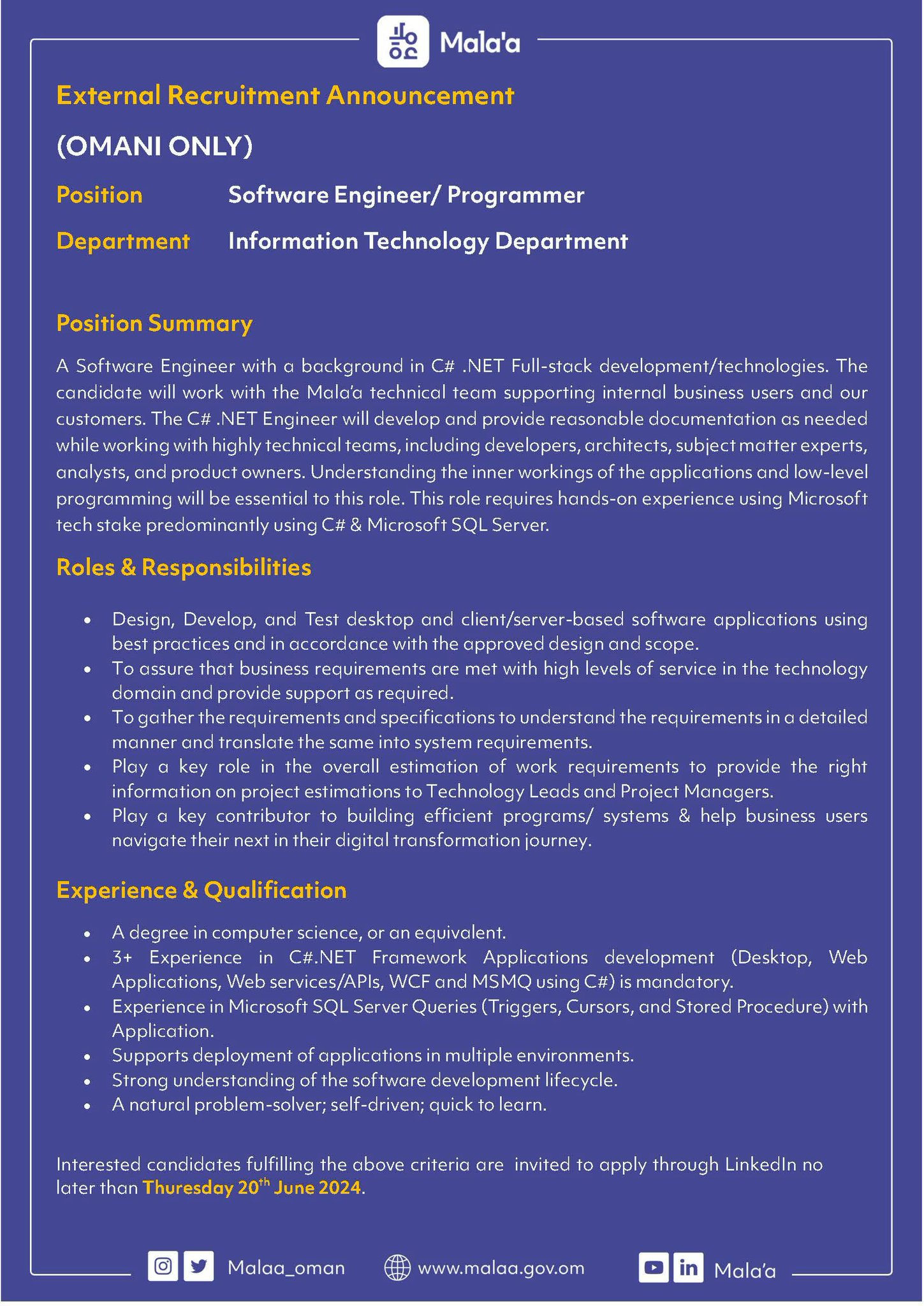 مركز ملاءة - توفّر شاغر لوظيفة (مهندس برمجيات/مبرمج)