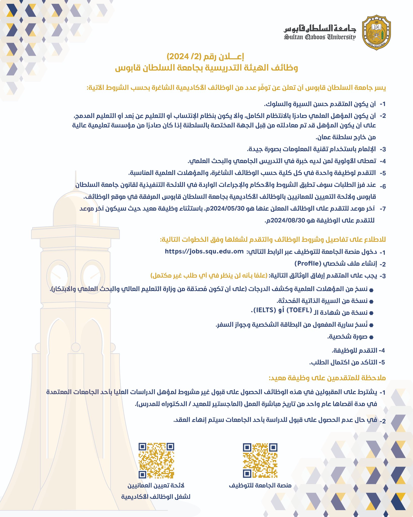 جامعة السلطان قابوس - وظائف الاكاديمية الشاغرة