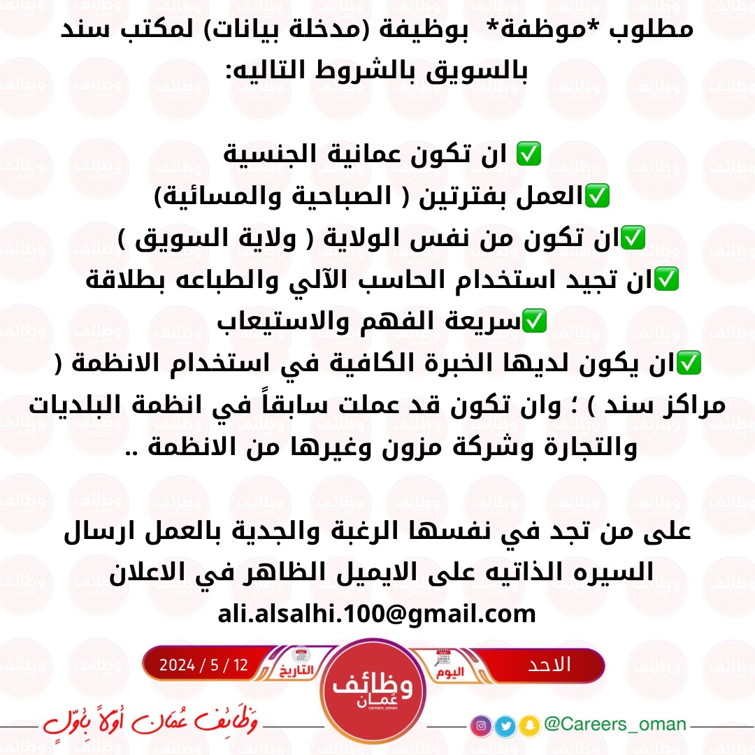 مكتب سند في السويق - وظيفة شاغرة ( مدخلة بيانات )