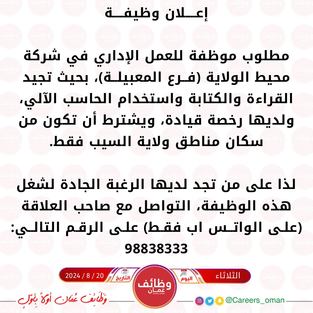 شركة محيط الولاية فرع المعبيلة - وظيفة شاغرة ( موظفة )